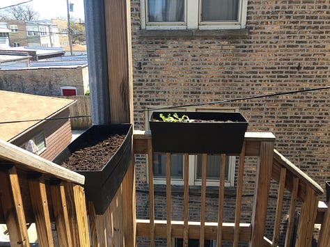 Then there was a series of north side community garden plots and more back deck attempts in the hard-scrabble spaces no one has another use for — along the rail road, in a shallow bed over an asphalt parking lot, perched atop a railing. You get the idea.